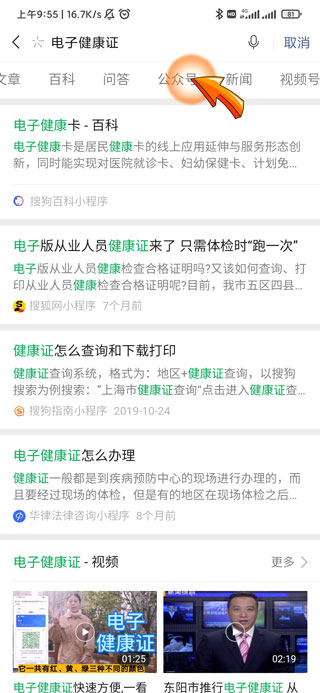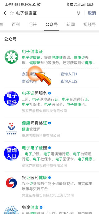 领取电子健康证需要打开微信APP,点击页面右上角的“放大镜”图标,然后点击页面上方的“搜索栏”,输入电子健康证文字后点击“搜索”选项,再点击“公众号”选项,最后点击“办健康证”选项即可。