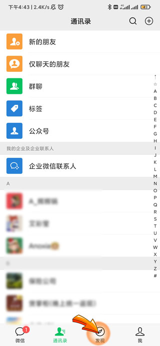 1、微信发表动态首先需要打开微信APP,点击页面右下角“发现”图标。