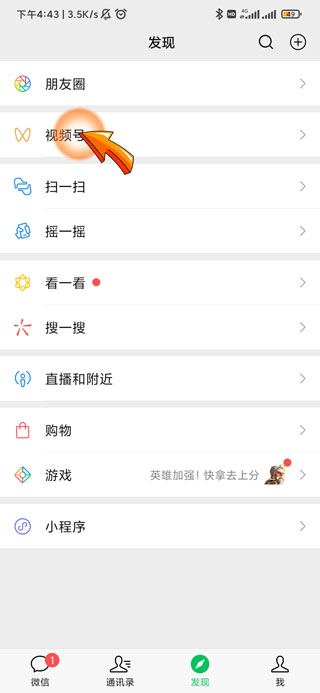 2、然后点击发现页面中的“视频号”选项。