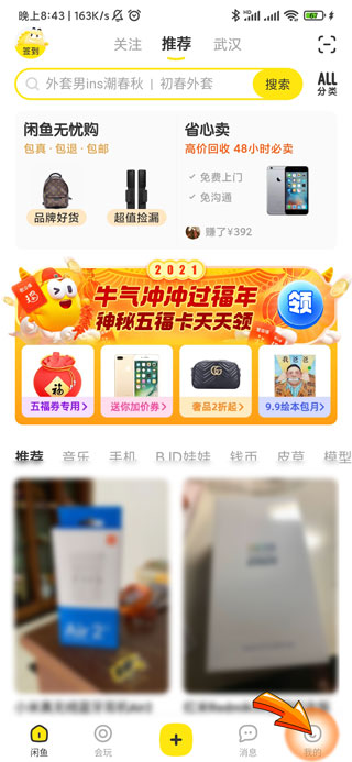 1、闲鱼玩家认证首先需要打开闲鱼APP,点击页面右下角的“我的”图标。