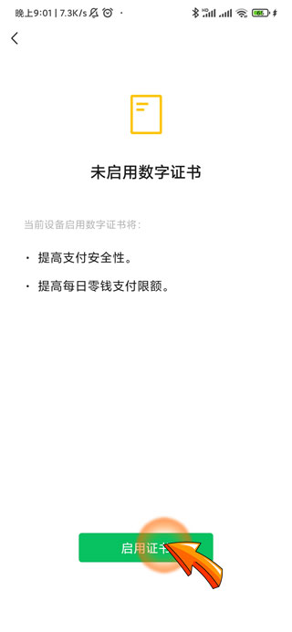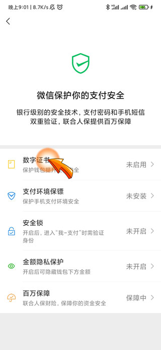 微信零钱支付被限制了说明当天的支付额度过高,此时可以开启数字证书提高支付额度,首先打开微信APP,点击页面右下角的“我”的图标,然后点击“支付”选项,之后点击“钱包”图标,再点击“安全保障”选项,点击“数字证书”后将其开启即可。