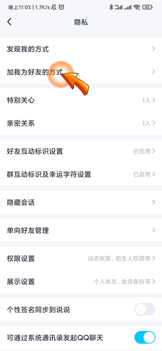 4、之后在设置页面中点击“加我为好友的方式”选项。