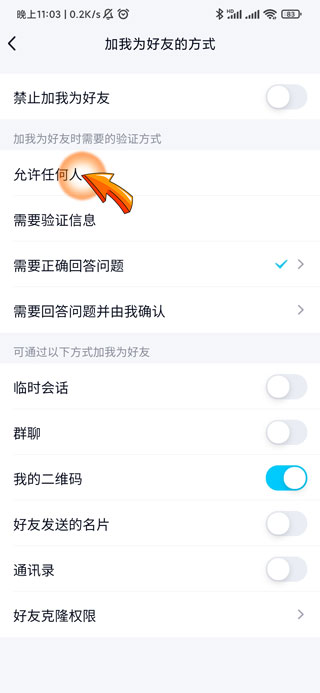 5、最后点击“允许任何人”选项即可,或者选择其它的验证方式。