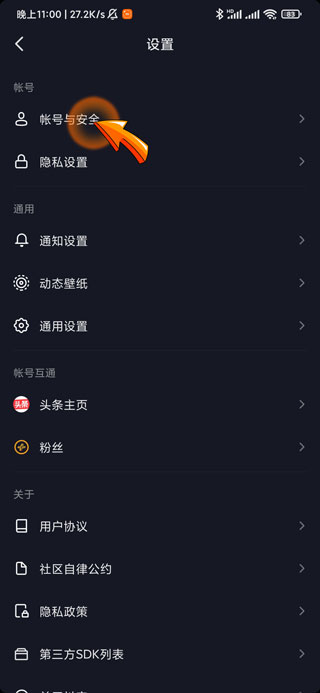 4、进入设置页面后点击“账号与安全”选项。