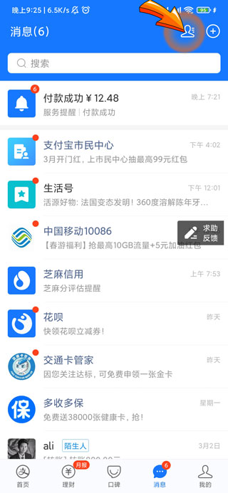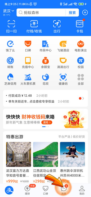 1、支付宝删除好友首先需要打开支付宝APP,点击页面右下方的“消息”图标。