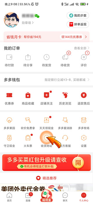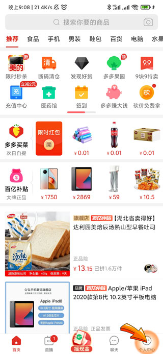 1、拼多多修改地址首先需要打开拼多多APP,点击首页右下角“个人中心”图标。