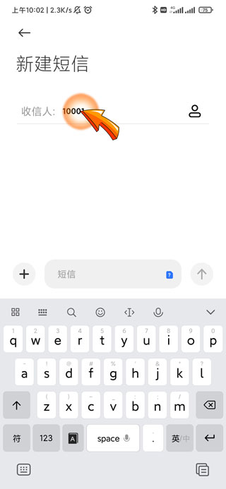 2、然后在短信编辑界面中的收信人后方编辑“10001”。