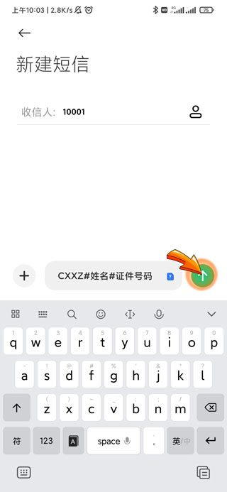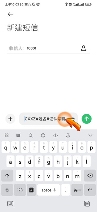 3、之后发送编辑内容“CXXZ#姓名#证件号码”。