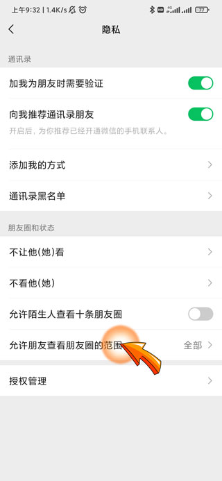 4、之后点击页面下方的“允许朋友查看朋友圈的范围”选项。