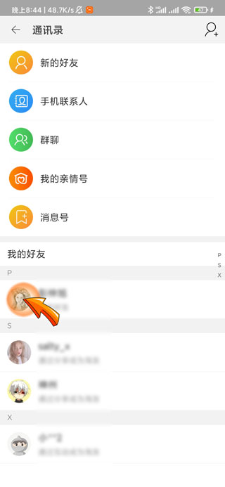3、之后在我的好友页面中找到并点击对方的“头像”图标。