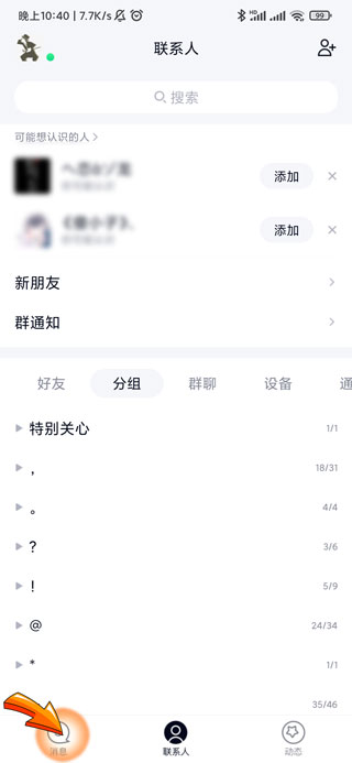 1、手机qq查看在线状态需要打开QQAPP,点击首页左下角的“信息”图标。