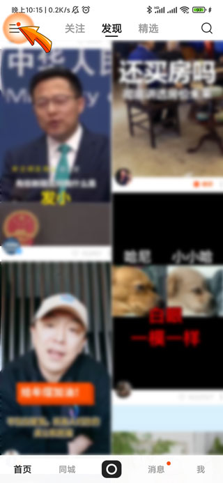 1、快手注销账号首先需要打开快手APP,点击首页右上角的“三横”符号。