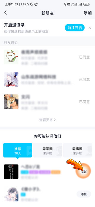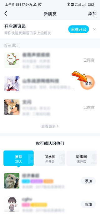 手机qq查看历史添加需要打开QQAPP,点击首页中“新朋友”选项,好友通知下方即为历史添加记录,同时可以点击对方名称右侧的“同意”选项进行添加,或者点击页面下方的可能认识人右侧的“添加”选项,编辑好验证信息后点击“发送”选项即可。