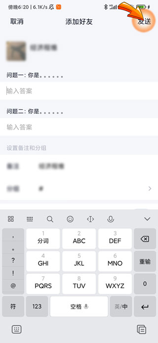 4、最后填写验证信息后点击右上角的“发送”选项即可添加对方。
