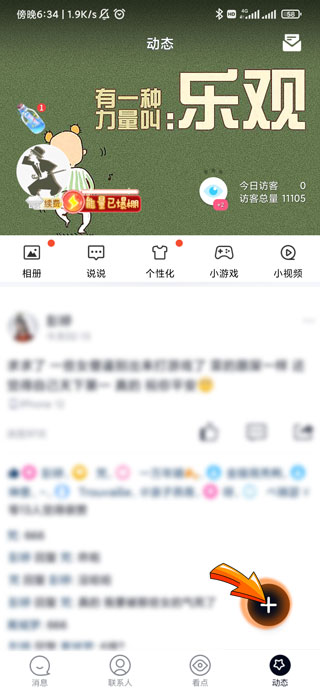 2、进入动态页面后,点击右下角的“加号”图标。