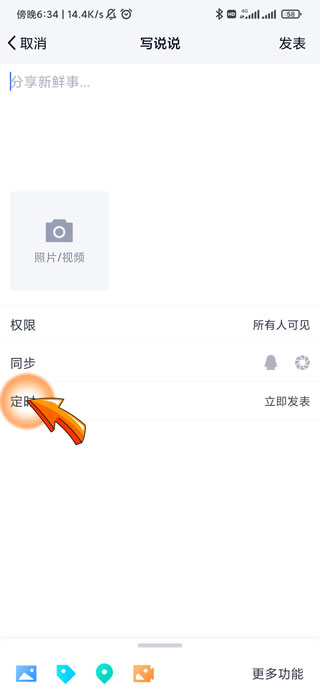4、最后点击编辑说说页面中的“定时”选项即可定时发送说说,并同步到微信朋友圈。