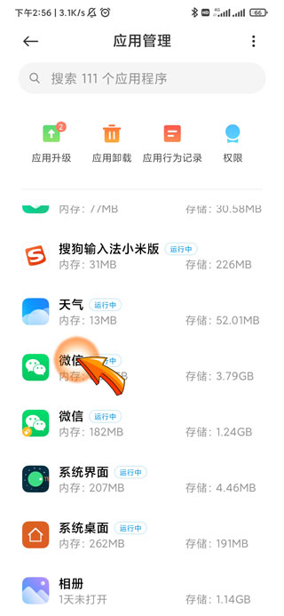 3、之后在应用管理界面中找到并点击“微信”选项。