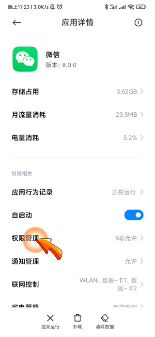微信步数没走路显示走了好多是因为手机没有授予微信运动权限,首先点击桌面上的“手机管家”图标,然后点击“应用管理”选项,找到并点击微信图标,之后点击应用详情页面中的“权限管理”,最后点击授予“获取身体运动信息”权限即可。
