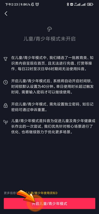 5、最后点击“开启儿童/青少年模式”即可打开青少年模式。
