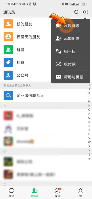 2、然后点击弹出窗口中的“发起群聊”选项。