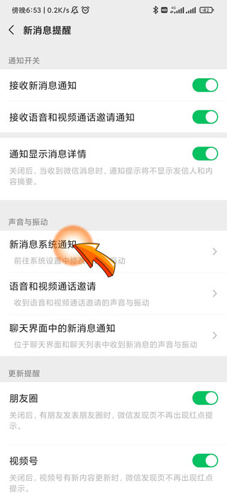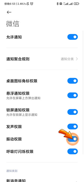 微信振动调整需要打开微信APP,点击右下角“我”的图标,然后点击我的页面中的“设置”选项,之后点击“新消息提醒”选项,再再点击“新消息系统通知”选项,最后点击开启“振动权限”右侧的开关按钮即可。