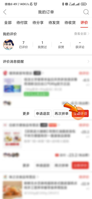 3、进入我的订单页面后,点击订单右下角的“立即评价”选项。