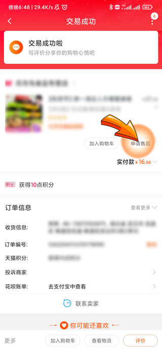 4、再点击订单右下角的“申请售后”选项。