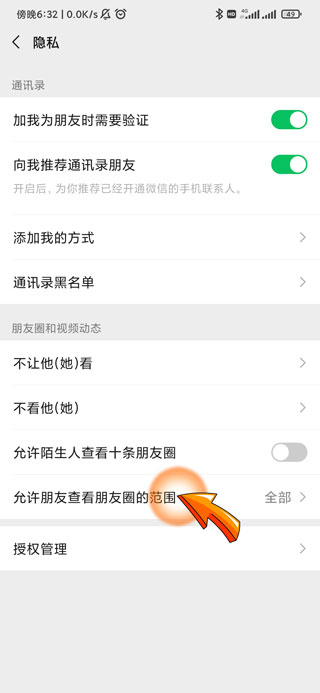 4、再点开隐私页面下方的“允许朋友查看朋友圈的范围”选项。