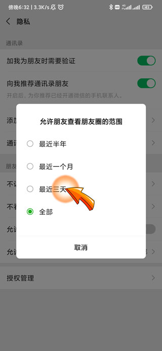 5、最后点击“最近三天”选项即可将朋友圈设置为三天可见。