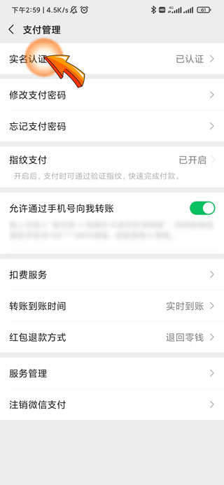 4、最后点击支付管理页面顶部的“实名认证”选项即可进行身份认证。