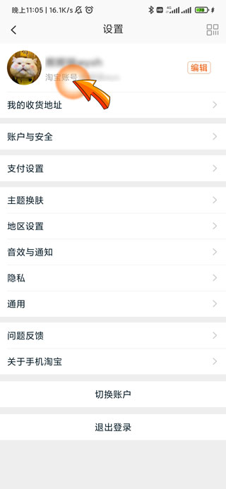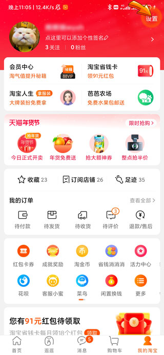 2、进入我的淘宝页面后,点击右上角的“设置”选项。