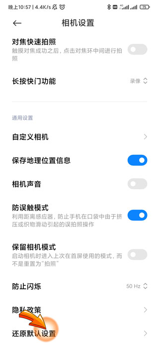4、最后将页面滑到最底部,点击“还原默认设置”选项后再打开相机进行尝试。