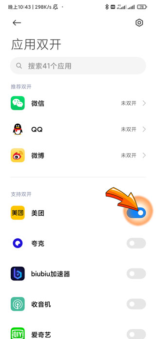 4、最后点击打开需要双开应用右侧的“开关”按钮即可。