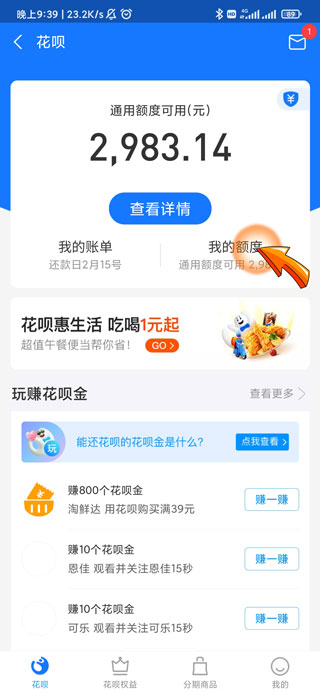 3、进入花呗页面后,点击“我的额度”选项。
