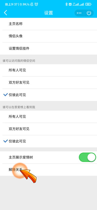 5、最后点击设置页面中的“解除关系”选项即可单方面解除qq情侣空间