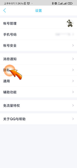 3、进入设置页面后,点击“隐私”选项。
