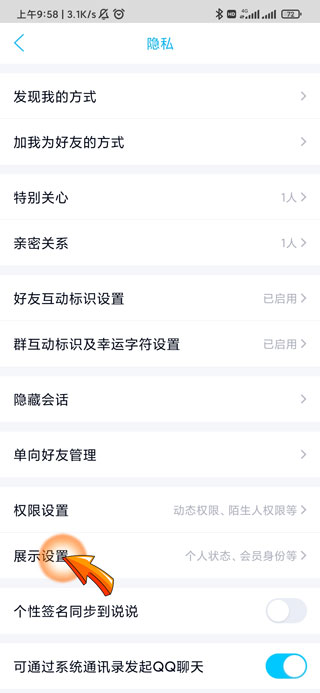 4、然后点击隐私页面下方的“展示设置”选项。