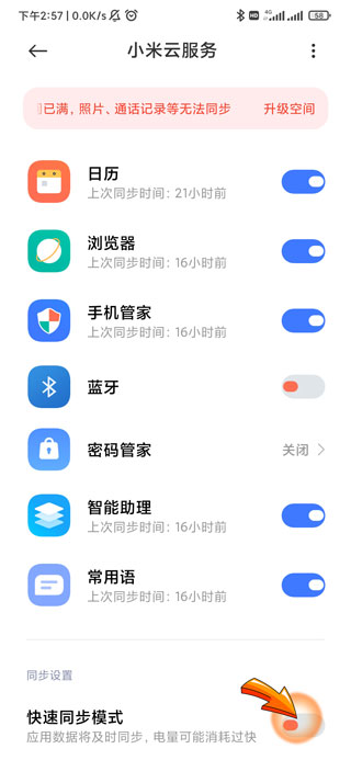 5、最后点击关闭同步设置中的“快速同步模式”右侧的开关按钮即可。