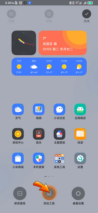 手机恢复删除了的时间需要长按手机桌面上的“空白区域”,此时页面下方会弹出多个选项,点击中部的“添加工具”图标,最后选择需要添加的“时间”样式,点击后即可出现在桌面上。