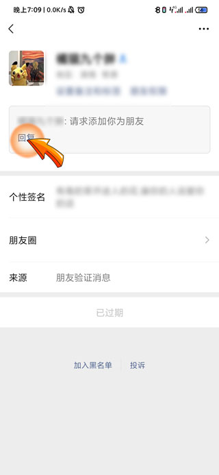 3、最后点击信息框中的“回复”选项让对方重新添加即可。