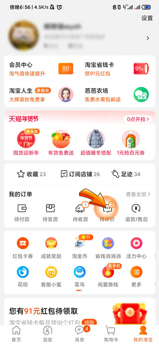 1、淘宝追加评论首先需要打开淘宝APP,点击首页右下角的“我的淘宝”图标。
