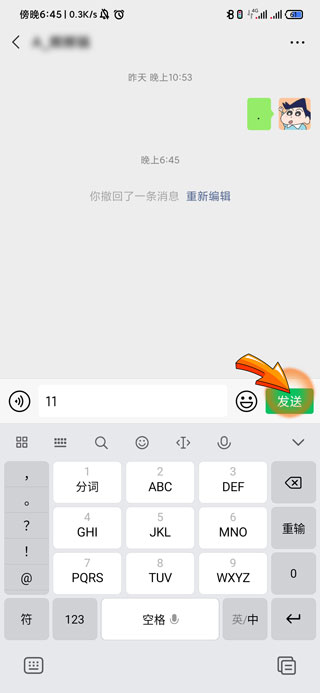3、此时撤回的聊天记录会恢复在输入窗中,重新编辑后点击右侧的“发送”选项即可。