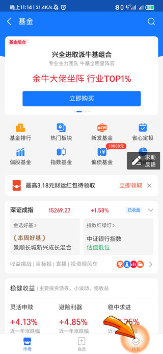 3、最后点击基金页面右下角的“持有”图标即可查看支付宝购买的基金。