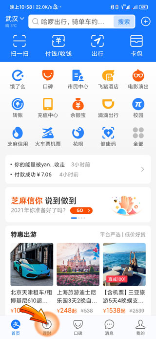 1、支付宝查看购买的基金首先需要打开支付宝APP,点击首页右侧的“理财”图标。