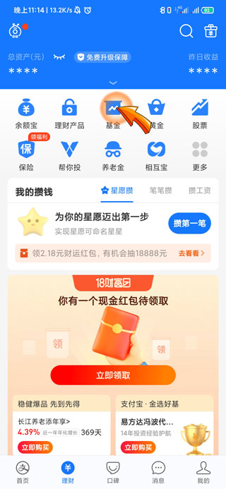 2、进入理财页面后,在页面上方找到并点击“基金”选项。
