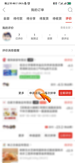 拼多多申请换货后需要跟客服进行协商处理,然后将物品寄回卖家,等待卖家重新发货,拼多多申请退款则需要打开拼多多APP,点击右下角“个人中心”选项,然后点击页面中部的“评价”图标,最后点击订单下方的“申请退款”即可。