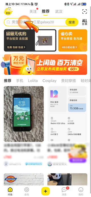 1、闲鱼搜索卖家首先需要打开闲鱼APP,点击首页顶部的“搜索栏”图标。
