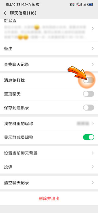 3、最后在群聊信息页面中找到“消息免打扰”选项,点击开启右侧的开关按钮即可。