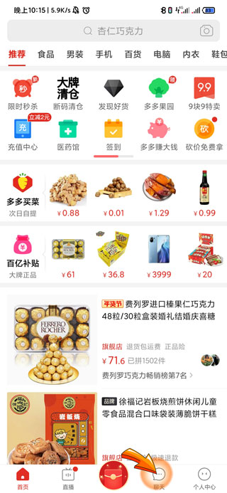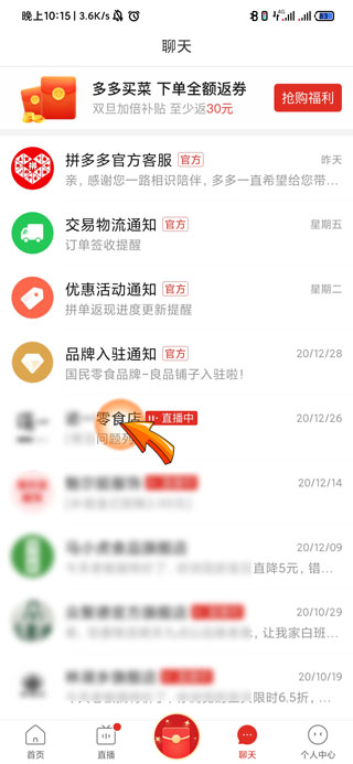 1、拼多多查看店铺地址首先需要打开拼多多APP,点击首页下方的“聊天”图标。
