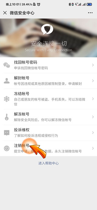 5、最后点击微信安全中心页面底部的“注销账号”选项即可进行微信号注销。